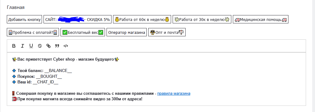 - - Вариант сложнее кнопка страница, тут нужно ввести имя кнопки, например оператор, а потом указать текст который бот отправит при нажатии на неё, например, пиши оператору в тг https://t.me/auo_service