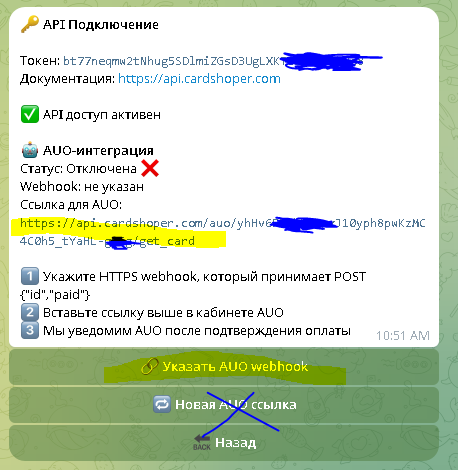 - - Возрашаемся в бот кардшопер, тот же профиль тоже подключение апи, жмём вебхук АУО и вставлем туда ссылку