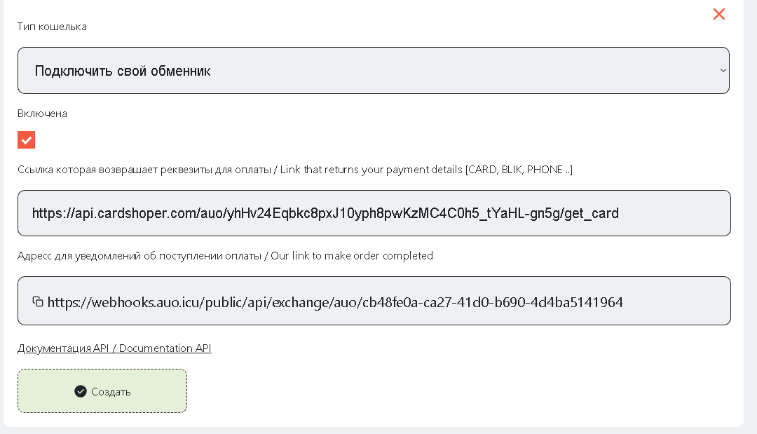 - - Когда скопировали, заходим на нашу админку cpanel - кошельки - создать - ваши обменники - вставляем туда ссылку и одновременно копируем ссылку на webhook жмём, включить, сохраняем